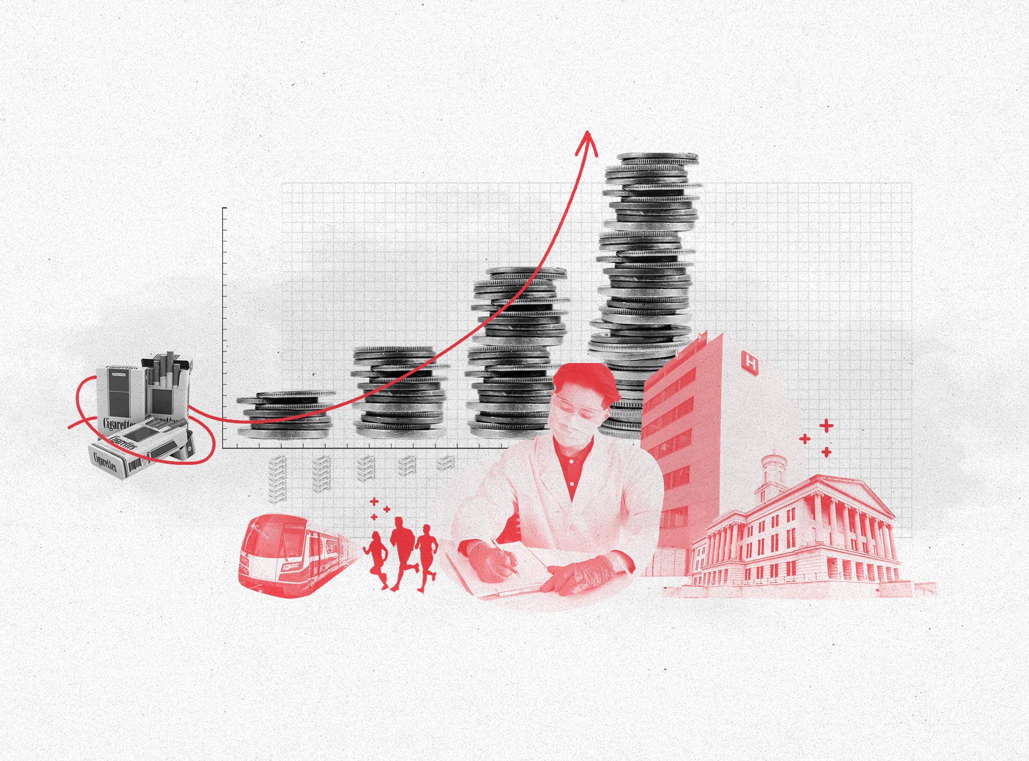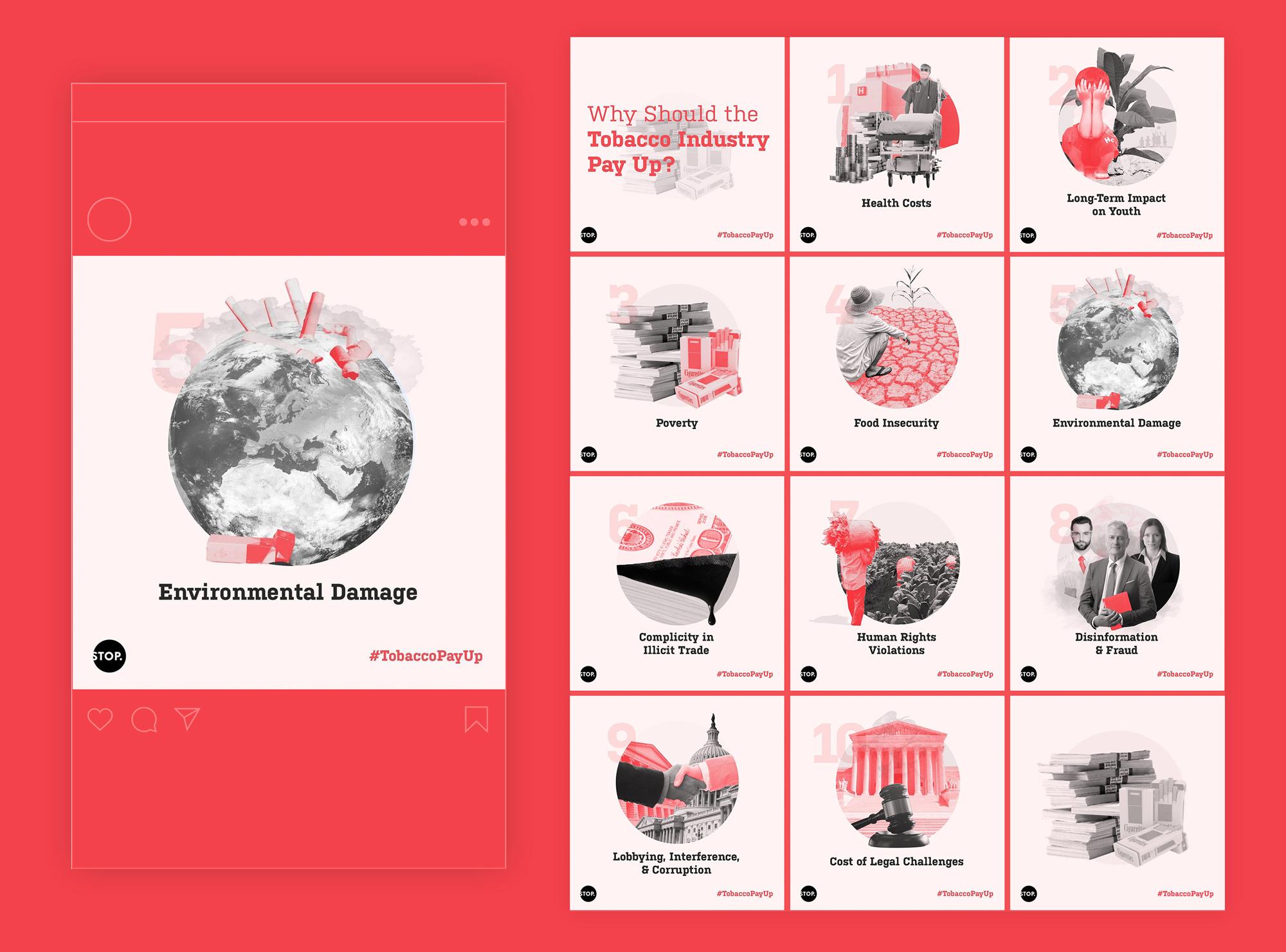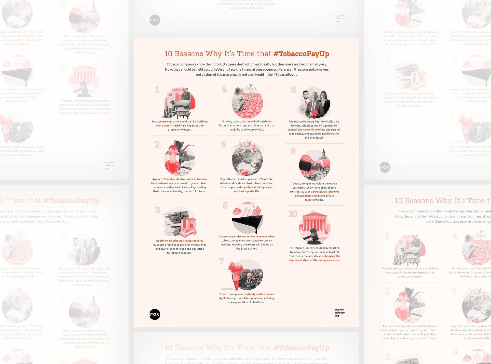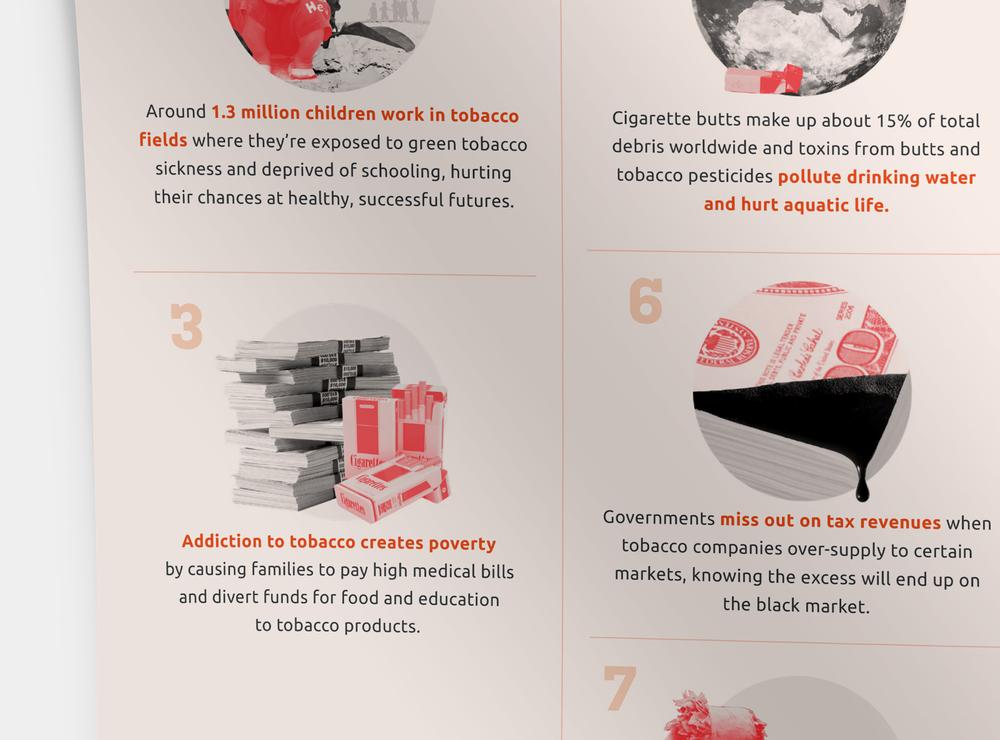 I designed a promotional campaign identity, including infographics and a series of illustrations, for the tobacco industry watchdog STOP's campaign to raise awareness of the tobacco industry's avoidance of taxes and complicity in harming public health, society, the economy, and the environment.