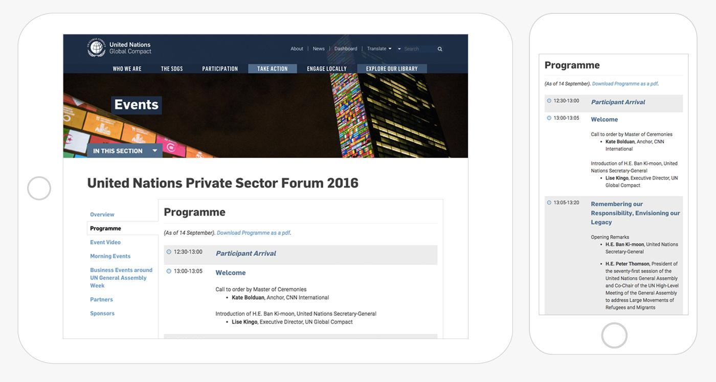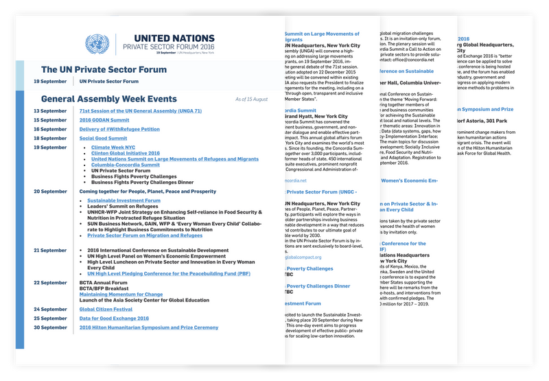 I worked with colleagues at the United Nations Global Compact to develop and design an array of print and digital collateral (logomark, web pages, email campaigns, banners, social media assets, etc.) for the The United Nations Private Sector Forum, an annual gathering of the UN, governments, business, and civil society.