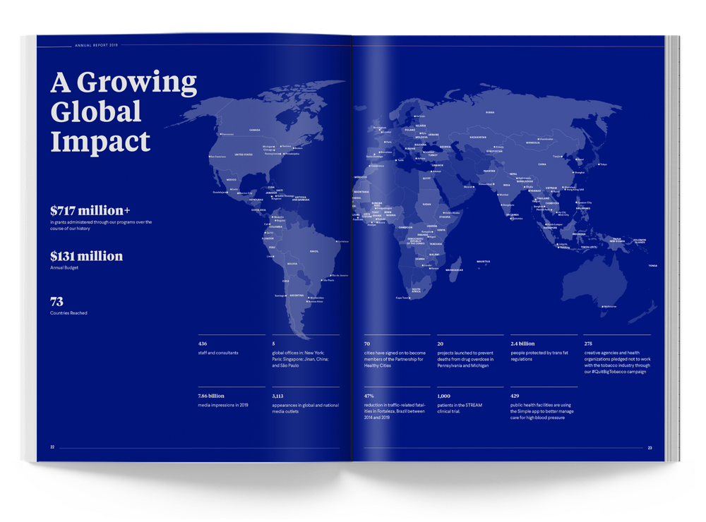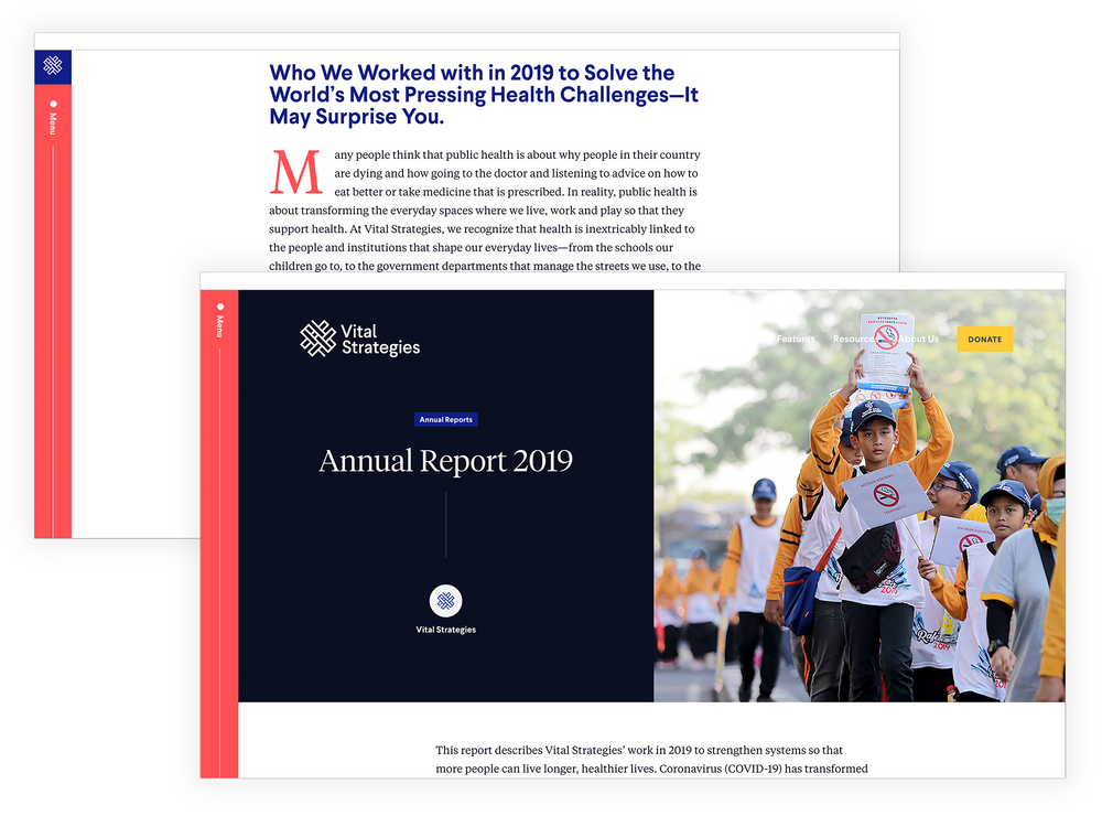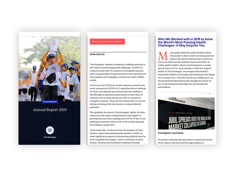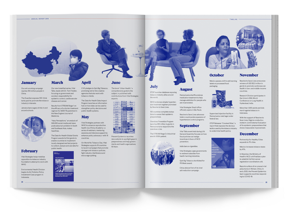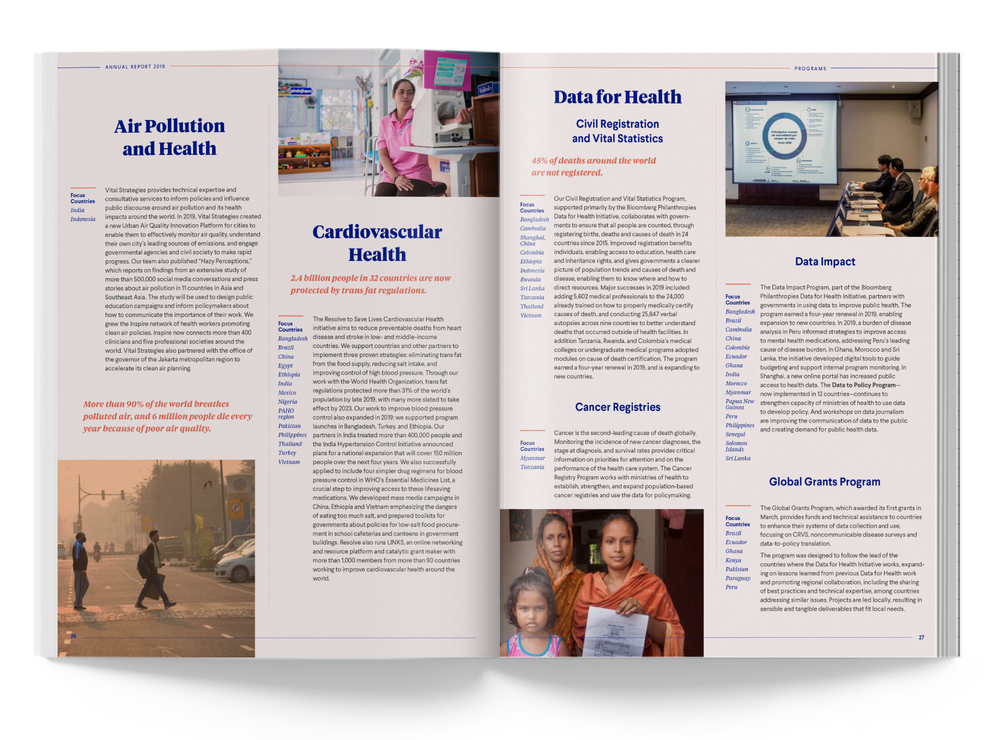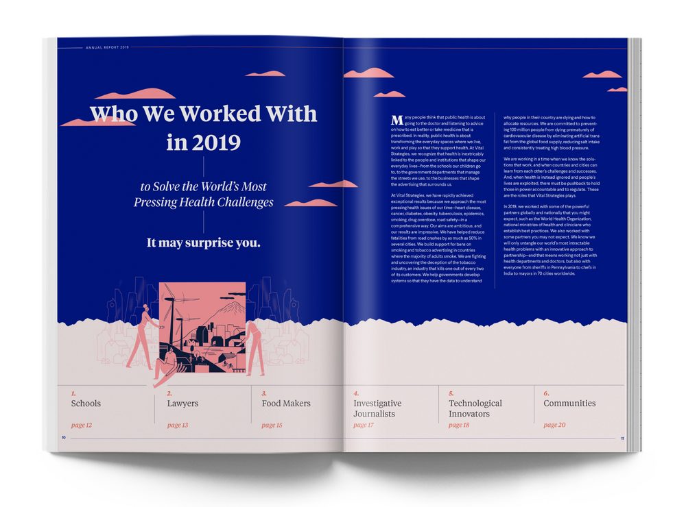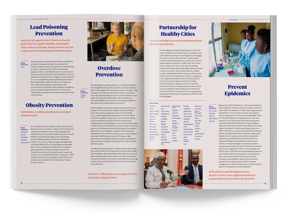 I was responsible for overall direction, design, and production of the printed and digital Vital Strategies 2019 Annual Report.